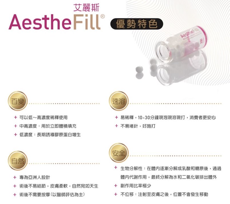 AestheFill®艾麗斯是一種長效性促進膠原蛋白再生型填充材料,作用可以維持一年半至兩年。將其注入皮膚深層後能促進增生自體膠原蛋白,進而填補皮膚凹陷的部位,維持自然豐潤感。其主要成份為聚『雙旋』乳酸PDLLA具有生物相容性及可由生物分解、代謝的特性,巳被證實為可安全應用於人體的醫材