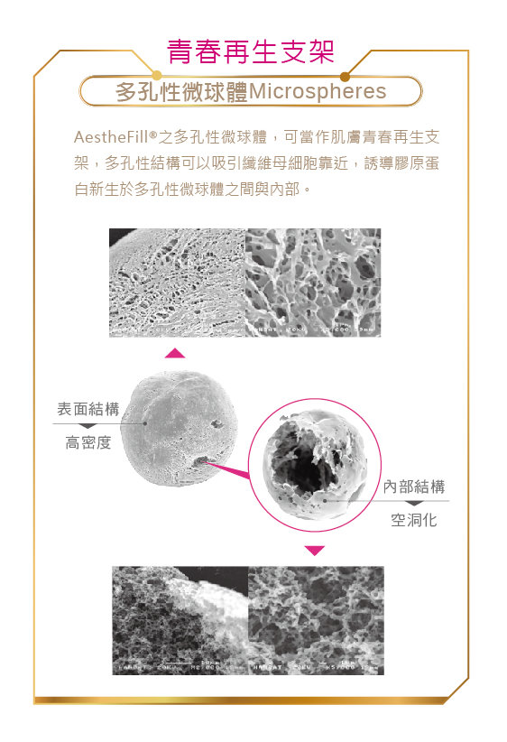 AestheFill®艾麗斯的產品外觀為白色球體,使用前需用無菌水泡製至少30分鐘使其溶解。泡製後的聚雙旋乳酸,在高倍數顯微鏡底下,會看到空洞的球體,這就是AestheFill的「多孔性微球體」科技。多乳性微球體進入皮膚後,可吸引膠原蛋白至球體內部居住、生長,漸漸長出更多自己的膠原蛋白。