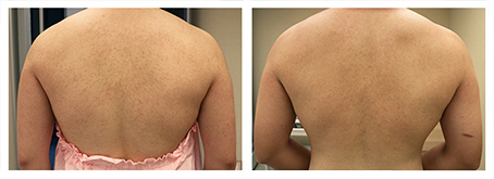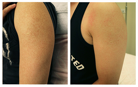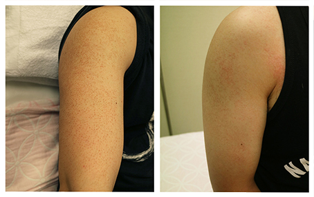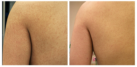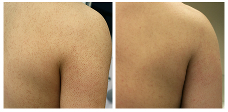 所謂的「毛囊角化症」是一種自體顯性的遺傳性皮膚疾病是因為先天基因導致的體質,使毛孔角質異常增生由於毛囊皮脂腺管之開口處有角化現象,形成所謂的「角」,而硬化之後會導致毛孔閉塞,分布區域最常見的依序是上臂(92%)、大腿(59%)、臀部(30%),臉頰也不少見,少數患者會全身分佈,外觀有如針點般的小丘疹,顏色呈膚色。摸起來會感覺一粒一粒的凸起,若毛孔的顏色更深,呈現暗紅或褐色,顆粒也會更粗糙,看起來很像是雞皮疙瘩。外觀上非常明顯,常常造成患者不敢穿短袖衣服的困擾。