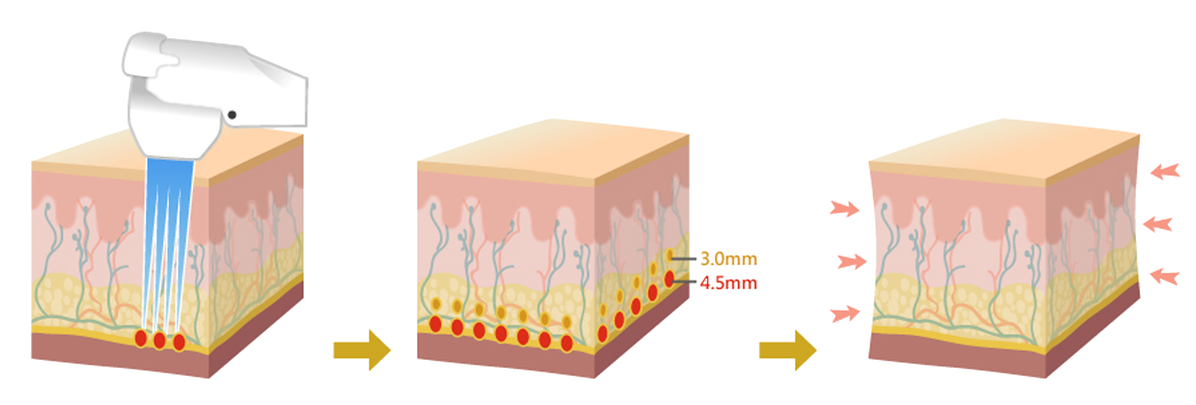 聲波的能量掠過表皮層,由細緻的小點連接成一線性,直接將能量聚焦於肌膚深層,此焦點的組織溫度在瞬間上昇到 65ºC 以上,使肌膚的SMAS筋膜層受熱收縮而達到拉提的效果。結合3.0、4.5兩種深度造就肌膚底層3D立體拉提的緊緻效果。